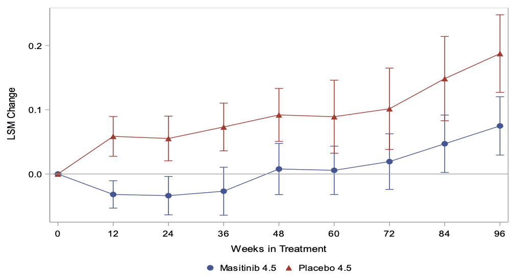 This phase 2a study showed that for the primary endpoint of MSFC (which measures symptoms of patients on three aspects: movement of the lower limbs, movement of the upper limbs, and cognitive tests), 32% of patients treated with masitinib were responders as compared with 0% with placebo. A clinical response was defined as > 100% change from baseline in MSFC score.